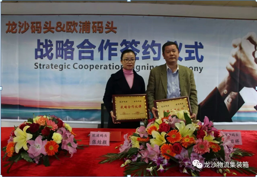 10:30分,良辰吉时,双方正式举行了战略合作的签约仪式。广东中交龙沙物流有限责任公司总经理杨日祥先生VS九江欧浦码头总经理张结颜女士郑重签署合作协议,并相互授受“战略合作伙伴”铜牌。