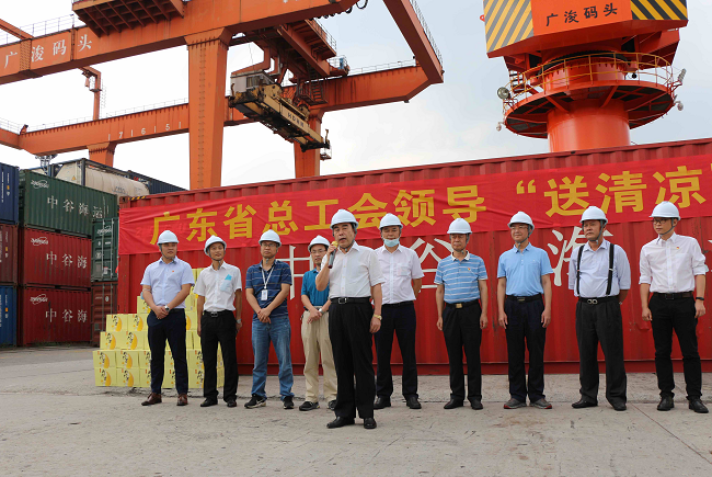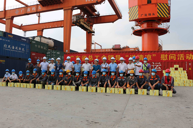 9月10日下午,省总工会副主席李和森一行来到龙沙物流公司看望慰问高温下坚守岗位的一线职工,为他们送上防暑降温清凉饮料。广州港集团工会副主席许鸿、龙沙物流公司总经理杨日祥、党总支书记刘文喜、副总经理张程业、工会主席黎锐志陪同慰问。