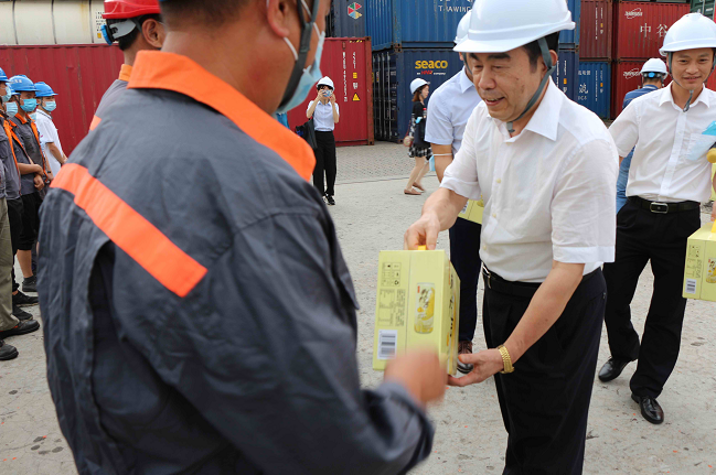 李和森一行首先来到码头前沿,逐一慰问了门机司机、理货、箱管、拖车司机等一线职工,为他们送上防暑降温清凉饮料。李和森代表省总工会向在高温下为保障港口货物装卸而默默坚守的龙沙物流公司职工表示诚挚的感谢,对他们为产业的复工复产作出的贡献表示肯定,并叮嘱大家在保证安全生产的同时,做好高温防暑工作,在各自岗位上继续发光添彩。