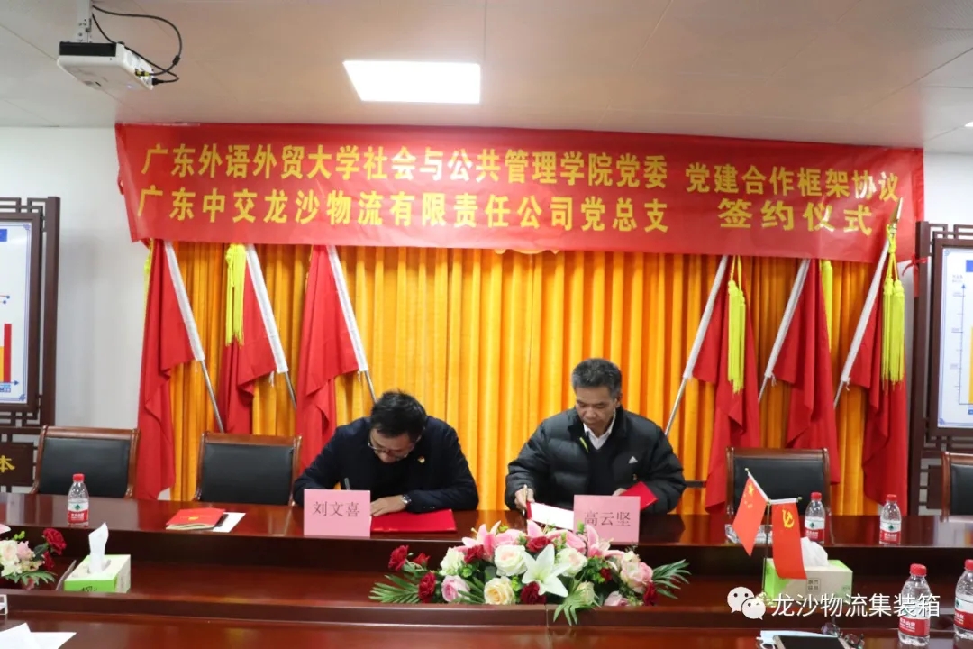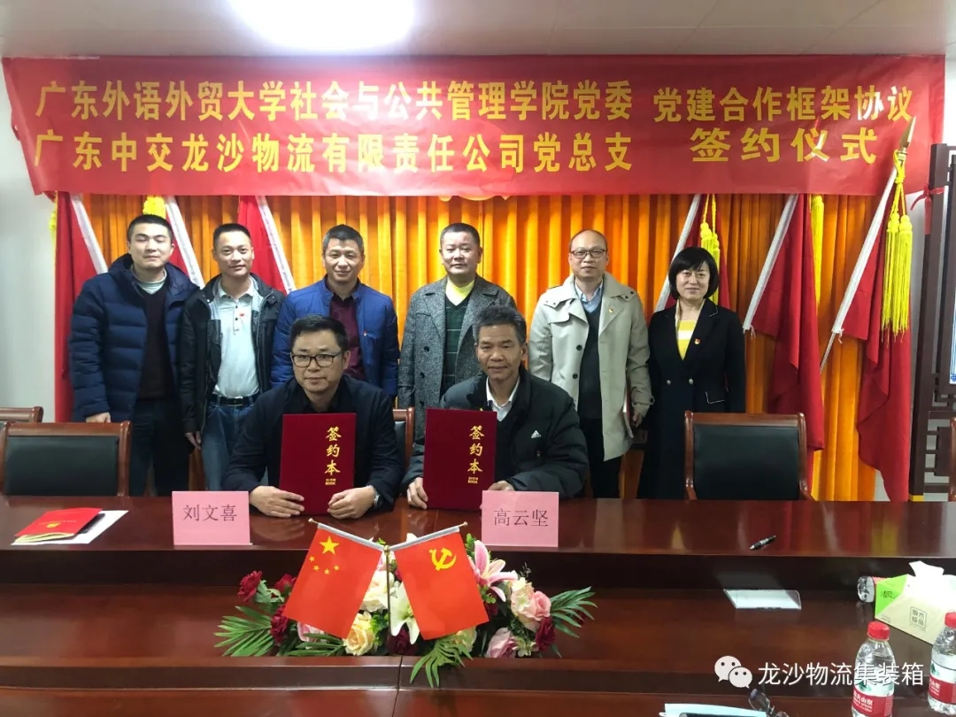为深入学习贯彻党的十九届五中全会精神,切实推进学习教育常态化、制度化,进一步落实新时代党建工作的新要求,拓展校企合作新领域, 1月14日,中共广东中交龙沙物流有限责任公司党总支、中共广东外语外贸大学社会与公共管理学院党委“校企党建合作框架协议”签约仪式,在龙沙物流公司举行。