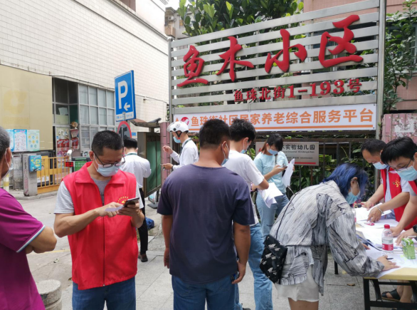 面对络绎不绝前来咨询、接种的居民,志愿党员们头顶烈日,身着志愿服,脸带微笑,积极引导疫苗接种队伍,维持排队秩序。志愿者们分工明确,有的协助群众疫苗接种预约服务,有的指引群众扫码登记、填写表格,有的向有疑虑居民们科普疫苗接种常识,分享感受,打消市民的疑虑。在志愿党员们的努力下,鱼珠社区接种工作正常稳步推进。